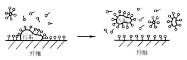 洗滌作用較復(fù)雜,是表面活性劑的潤濕、乳化、分散、增溶等綜合作用以及攪拌、揉搓、水流等機(jī)械作用的共同結(jié)果。以織物為例洗滌過程可用下式表示: